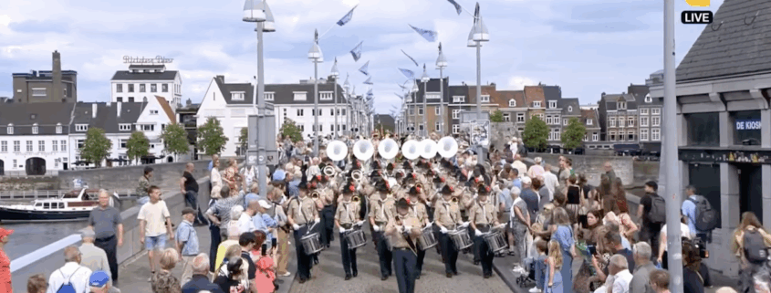 Tijdens de eerste ommegang van de zevenjaarlijkse Heiligdomsvaart op zondag 15 juni schitterde de band in volle glorie. Ook L1 was het opgevallen en van de commentatoren kregen we zowaar een paar veren in ons achterste gestopt. Dat is een machine…. De band was uitvoerig in beeld. Hoewel het op de Sint Servaasbrug erg krap is, is het wel een machtig beeld, zo 6 breed. Blijkbaar hebben we ook een nieuwe tambour-maître …